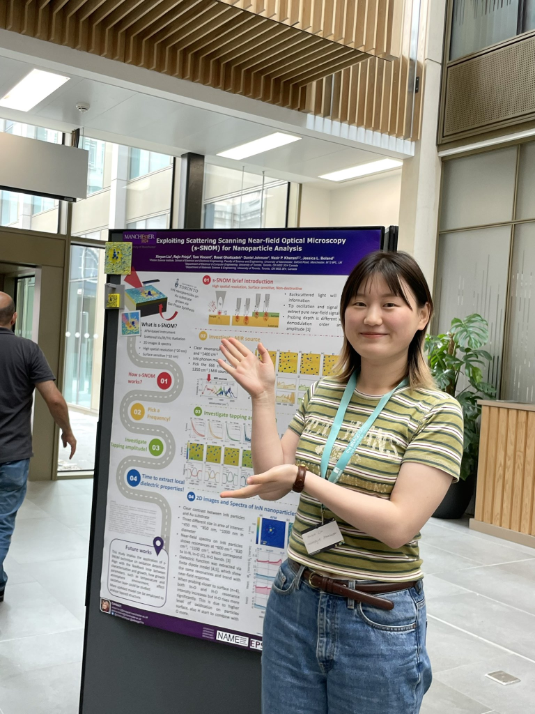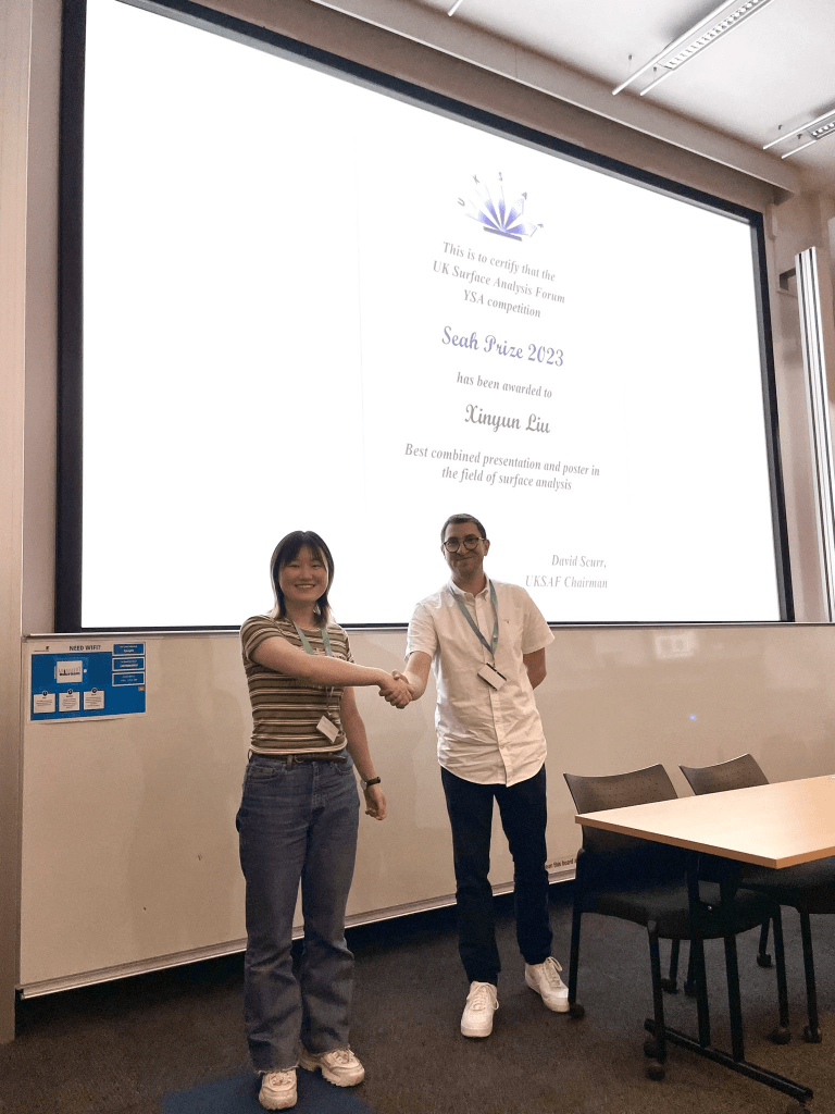 Our PhD student Xinyun Liu won Seah Prize for “best combined presentation and poster in the field of surface analysis” at UK Surface Analysis Forum (UKSAF) Summer Meeting held in Leeds, July 2023. Her poster and presentation are titled “Exploiting Scattering Scanning Near-field Optical Microscopy (s-SNOM) for Nanoparticle Analysis”.