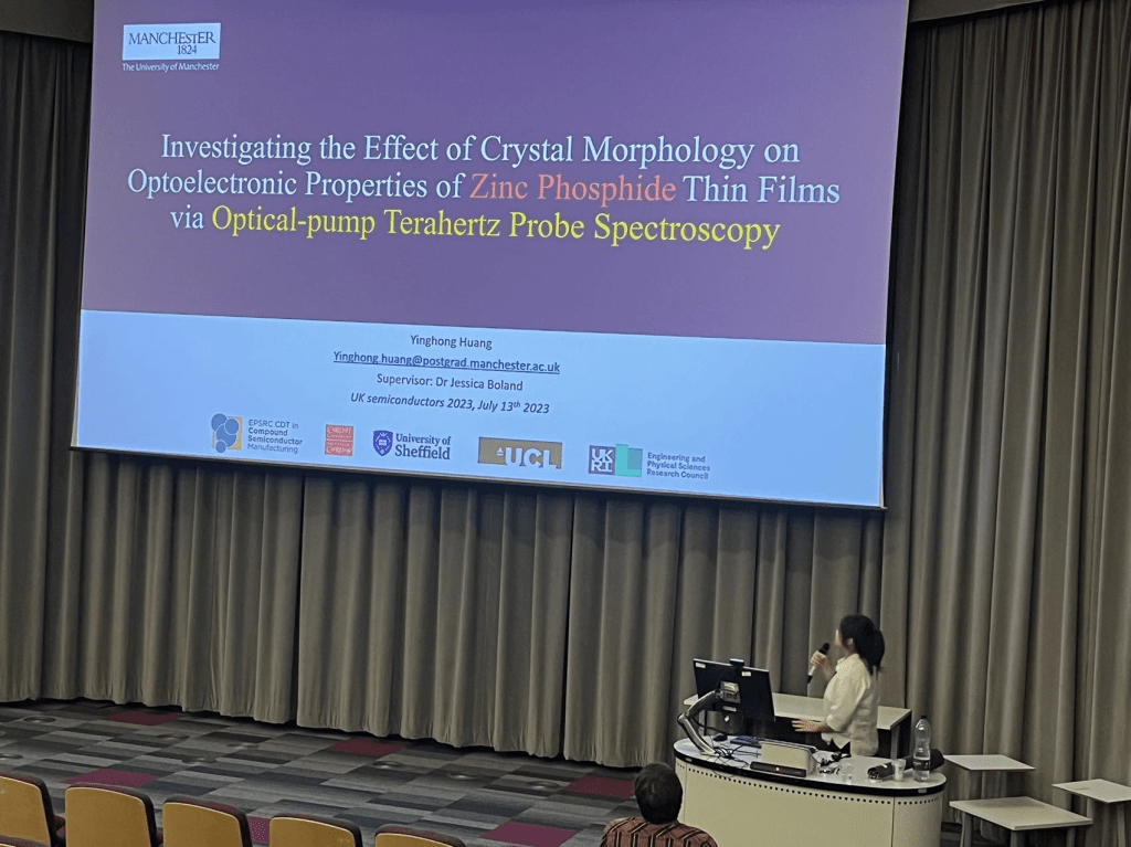 Our PhD student Yinghong Huang won 2nd prize for her 3 minutes flash talk at UK Semiconductor Conference July, 2023! Her talk is titled “Investigating the Effect of Crystal Morphology on Optoelectronic Properties of Zinc Phosphide Thin Films via Optical-Pump Terahertz-Probe Spectroscopy”.
